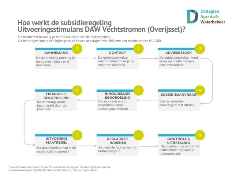 Met de subsidieregeling Uitvoeringsstimulans DAW Vechtstromen Overijssel kunnen agrariërs in het Overijsselse deel van waterschap Vechtstromen aan de slag met maatregelen op het erf en/of perceel die bijdragen aan een betere waterkwaliteit, meer waterbeschikbaarheid of een gezonde bodem. Er is 40% subsidie beschikbaar met een maximum van €12.500 per bedrijf.