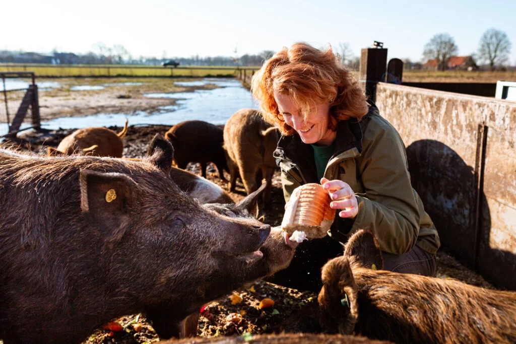Inge runt “De Goed Gevulde”, een natuurinclusieve kringloopboerderij. ‘Wij zijn een natuurinclusieve kringloopboerderij. We hebben zowel vee als akkerbouw.’ Op 17 hectare verbouwt ze uitsluitend humane gewassen en houdt ze kippen, varkens en bijen. De poel past binnen die manier van werken. ‘Een poel is eigenlijk huisvesting voor soorten die ons helpen met plaagbestrijding. Hoe meer leven er is hoe meer het elkaar in evenwicht houdt.’ Inge ziet dat natuurlijke plaagbestrijding in de praktijk werkt. ‘Toen we begonnen met varkens hadden we ontzettend veel muizen en ratten. We hebben toen hoge bomen geplant waar roofvogels in kunnen zitten. Nu hebben we geen overlast meer omdat we een natuurlijke vijand hebben geïntroduceerd.’